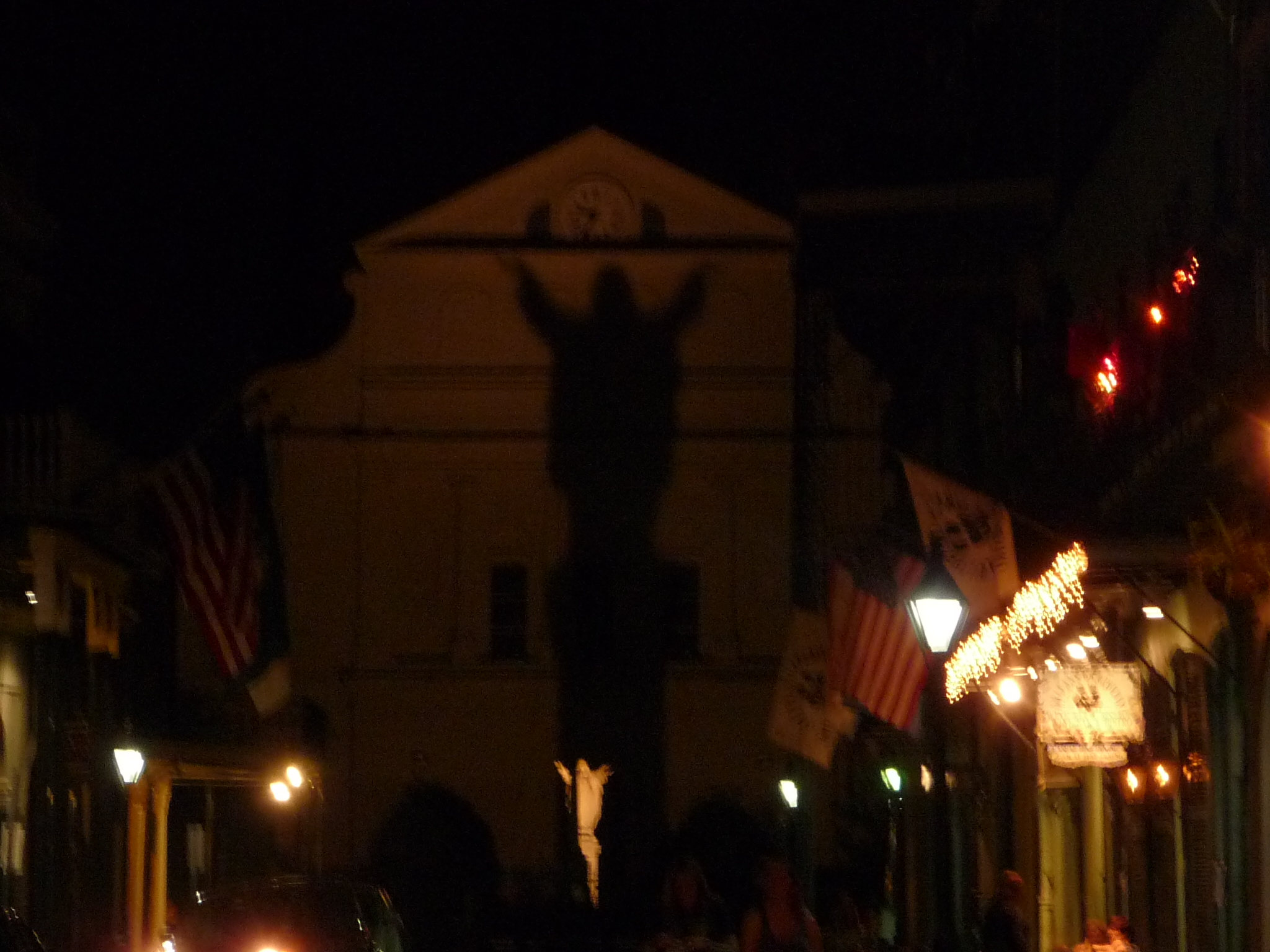 Left Natchez, MS. this morning around 9:00 am with overcast skies heading down Hwy. 61. If you consider riding the Blues Hwy. (61) when you get to Baton Rouge, LA. get off and find another route. There are so many Red lights and the speed limit is 65 mph so about the time you get going you have to hit the brakes. This is especially true going through Hammond, LA. which took us an hour to go 35 miles. We finally got on I-10 after having some lunch and made New Orleans in about 30 minutes.We had dinner on Bourbon Street at Nola’s. The food was good and the dessert even better. After dinner we walked Bourbon Street. Needless to say this is a world of its own (that prayer is definitely needed). Notice the shadow of Christ in one of the pictures coming from a statue. We were blown away with that. It was pretty cool to see considering what was going on here. Well it seems that where ever you look or have been there is always a need for prayer and for the Lord’s presence. May God’s glory shine on you and yours. God’s Speed from the cast of The Blues Hwy. Ride.