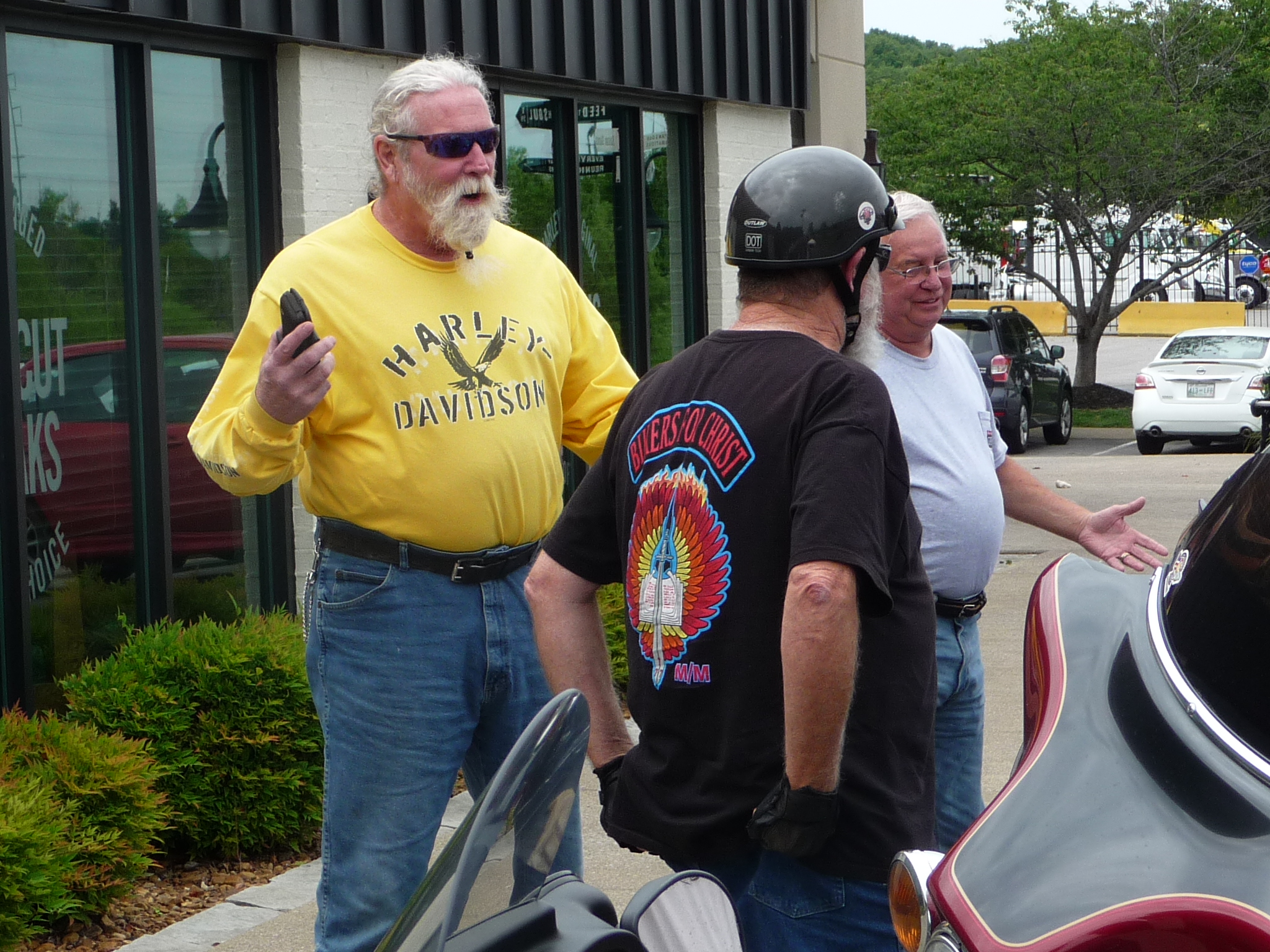 this morning around 7:00 am to meet everyone at Cracker Barrel on Hwy. 20 in Cartersville. After breakfast we headed up 75N t0 24W . Rode to Clarksville, TN. where we went to Appleton Harley Davidson. Our stay there was extended due to the rain. After appox. an hour and half we headed out on Hwy. 41A to Hwy.79 where we encounter another rain delay. Finally made it to The Land Between The Lakes which ran north to Kentucky with rolling hills, slow sweeping curves, deer and a occasional turkey followed by a squadrons of large dragon flies. If in the area it is worth the ride. Made it to Paducah, KY. late this evening. Rode 400 miles today , leaving for Springfield, MO. in the am. Despite the weather and delays we were still blessed by our God to enjoy the fellowship and laughter of each other which gave us the sonshine we needed.