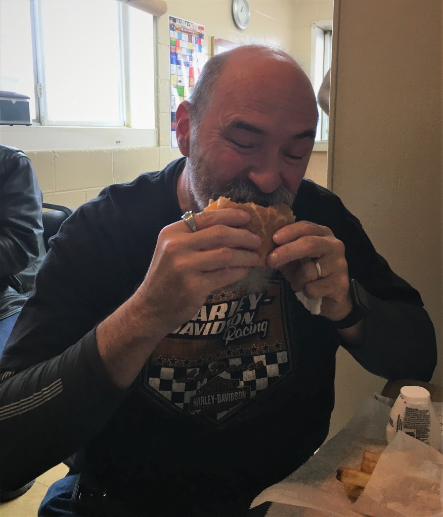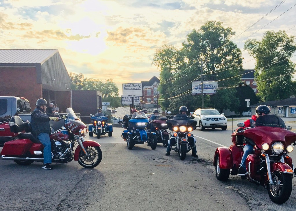 After breakfast this morning at Joan’s we heading West on 278 with the sun piercing through the early morning clouds behind us and cool temps ahead. Later in the day we turned North on 157 to Muscle Shoals, AL. were we got on 72 West. We stopped in Corinth, MS. at The White Trolley for lunch the home of The World Famous Slug Burger. I know that you all are really wanting to know a little more about the Slug Burger. This burger was developed during The Great Depression, it consist of beef, pork, grits and salt; then it’s made and into a patty and deep fried. The burger cost today is .99 and if you want cheese it’s $1.19. And we did have a few brave souls to try it, yes maybe to your dismay they enjoyed it. Myself I stay with the reliable All American Cheese Burger. Afterwards it was on to Olive Branch, MS. for the night. Also to the brother or brothers who bought our breakfast this morning, we thank you for the blessing. You never know how, when or where a blessing might come. But when one does come along you will definitely know it. It could as simple as a gentle smile with a soft spoken voice from a stranger, who gives you enough room for all for your hungry riding friends to have lunch together. Remember it’s not always the big blessing that brings warmth to the heart. We are thankful for our Heavenly Father’s traveling mercy and keeping us safe today as we begin our journey out West. Tomorrow we are heading to Russellville, AR.. God’s Speed and have a blessed evening.
